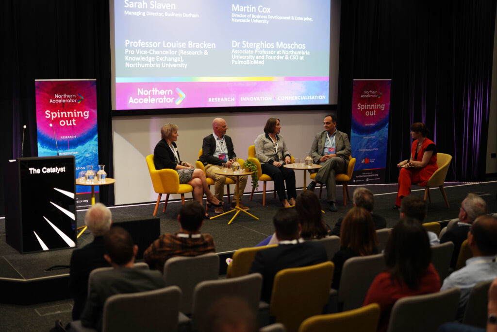 Host Jeni Smith of NetKno, chaired a panel discussion with Sarah Slaven, Managing Director of Business Durham; Professor Louise Bracken, Pro Vice-Chancellor of Research & Knowledge Exchange at Northumbria University; Martin Cox, Director of Business Development & Enterprise at Newcastle University; and Dr Sterghios Moschos, Associate Professor at Northumbria University and founder and CSO at PulmoBioMed Ltd. The panel discussed the importance of research commercialisation, the impact of spinouts and job creation, and the need for further development in the funding landscape for innovative businesses in the North East.